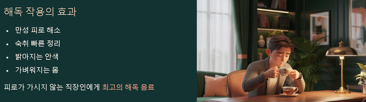 지친 간의 피로를 풀어줌으로써 전신 피로를 개선하고 신진대사를 원활하게 돕습니다. 간 수치가 높아 걱정인 분들에게 독소 정화의 기능을 제공하여 건강한 간 컨디션을 유지하게 합니다.