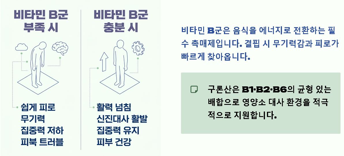 구론산에는 비타민 B1, B2, B6 등이 풍부하게 함유되어 있습니다. 비타민 B군은 우리가 섭취한 음식을 에너지로 전환하는 대사 과정의 필수 촉매제인데요. 신진대사 활성화 관리를 통해 무기력함을 덜어주고, 탄수화물과 단백질이 효율적으로 쓰이도록 영양소 대사 환경 지원 역할을 수행합니다.