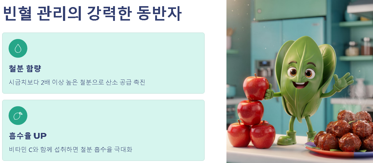 철분은 비타민 C와 함께 섭취할 때 흡수율이 높아지는 특성이 있습니다. 깻잎 자체에도 비타민 C가 들어있지만, 레몬즙을 곁들이거나 과일과 함께 섭취하는 구성이 빈혈 예방 효율을 높이는 데 도움이 될 수 있습니다.