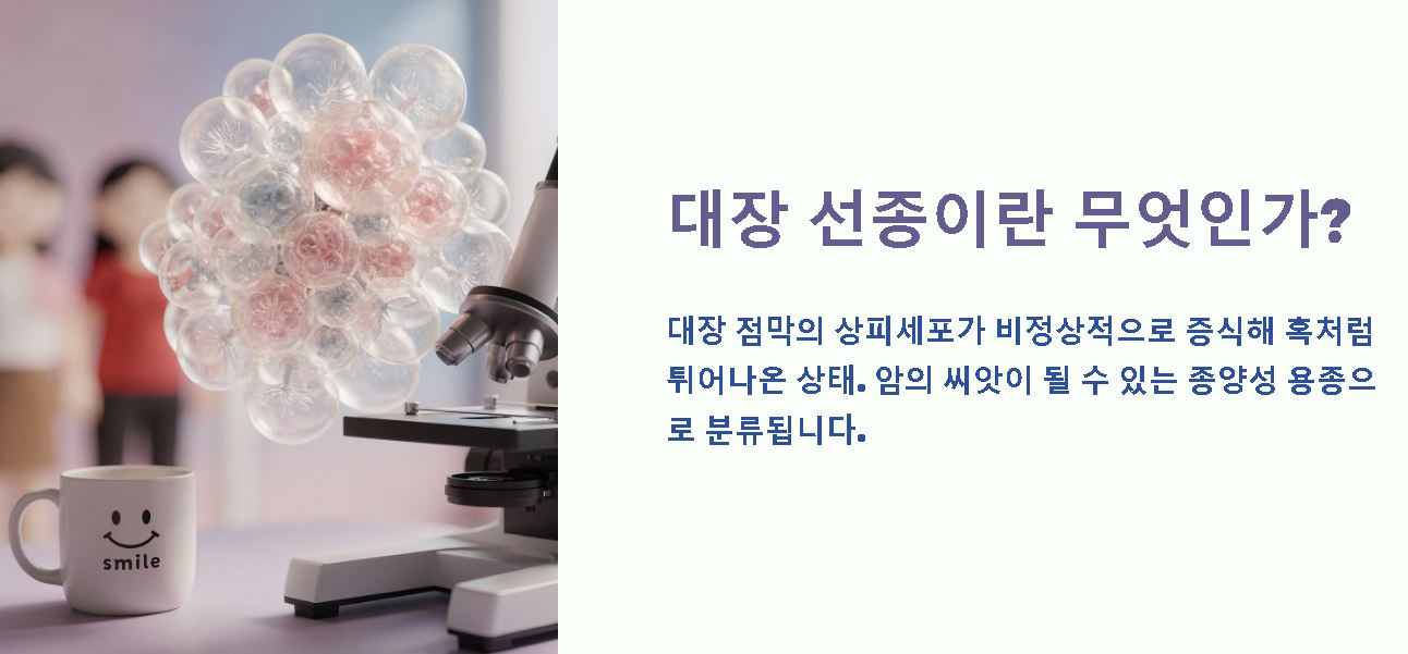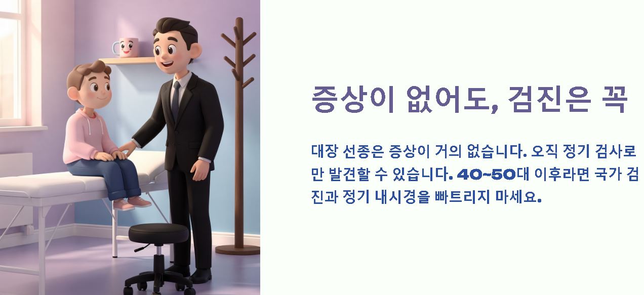 • 가족력 공유: 가족 중 대장암 환자가 있다면 더 이른 나이부터 선종 발견 관리 보조를 시작하세요.