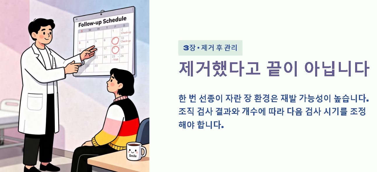 • 정기적 내시경 수행: 선종은 재발 가능성이 있으므로 정해진 주기에 맞춘 검사 유지를 돕습니다.