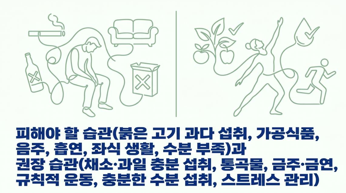 • 고지방·고열량 식단: 붉은 고기와 가공육 섭취는 장내 담즙산 분비를 늘려 점막 자극 관리에 불리합니다.• 식이섬유 부족: 장 통과 시간이 길어지면 독소 노출 시간이 늘어나므로 충분한 채소 섭취 관리가 유익합니다.