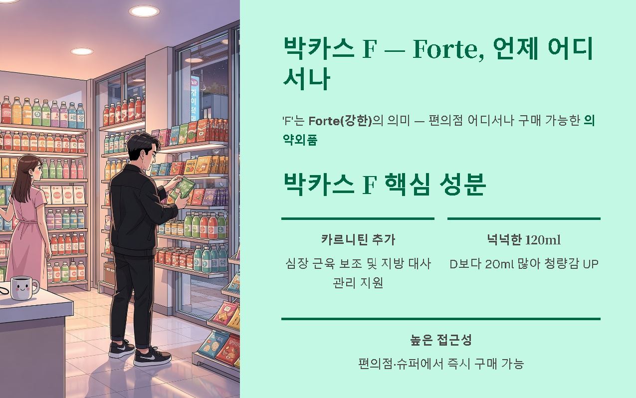 2) 박카스 F (Forte): 카르니틴 함유와 유통의 편의성