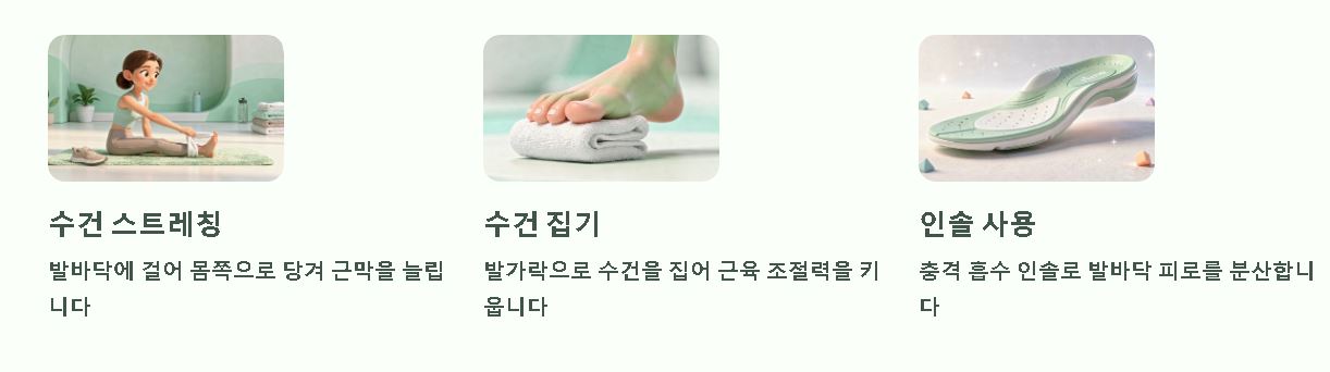 • 일상 속에서 발가락으로 수건을 집어 옮기는 동작을 통해 근육의 조절 능력을 키우는 자세가 권장됩니다.