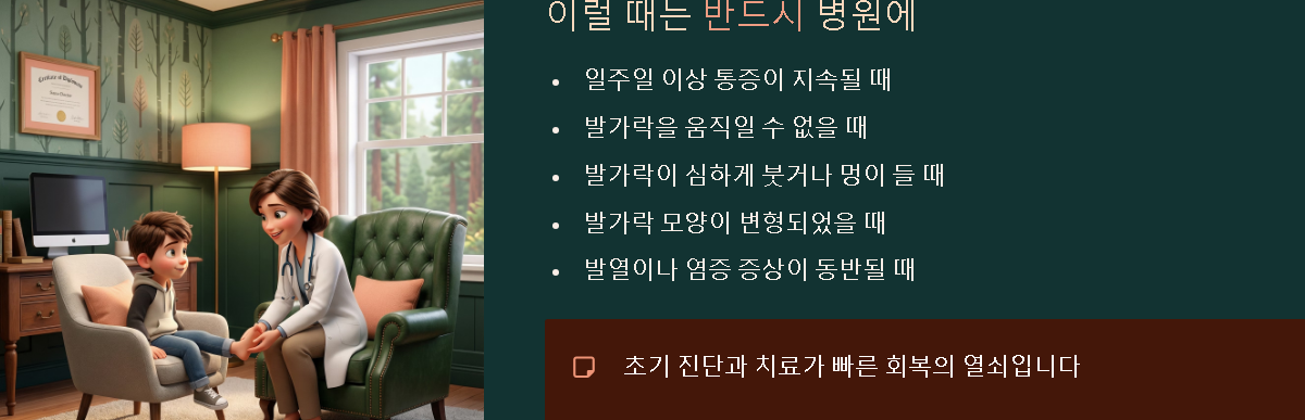 발가락 통증이 심해지거나, 발가락에 붓기나 발목 변형이 나타나는 경우에는 병원에 가야 합니다. 또한, 통증이 며칠 이상 지속되거나, 발가락에 극심한 통증이 발생하면 병원에서 정확한 진단을 받아야 합니다. 특히 무지외반증, 발가락 관절염과 같은 질환이 의심되는 경우, 전문의의 진료를 받는 것이 중요합니다.