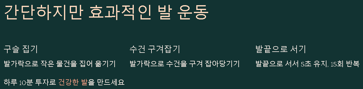 발 운동: 발가락을 자주 스트레칭하고, 발에 부담을 주지 않는 운동을 하는 것이 좋습니다.