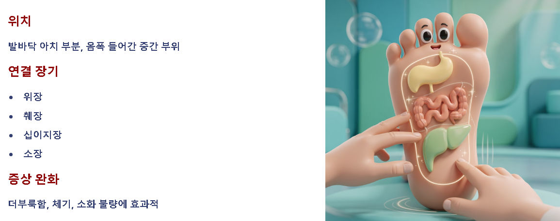 발바닥의 아치 부분, 즉 옴폭 들어간 중간 부위는 위장, 췌장, 십이지장 등 소화 기관의 반사구로 알려져 있습니다. 식사 후 속이 더부룩하거나 체기가 있을 때 이 부위를 위에서 아래로 쓸어내리듯 마사지하면, 위장의 연동 운동을 도와 소화를 촉진하는 데 긍정적인 작용을 기대해 볼 수 있습니다. 만성적인 소화 불량이 있는 경우 꾸준한 자극이 도움이 될 수 있습니다.