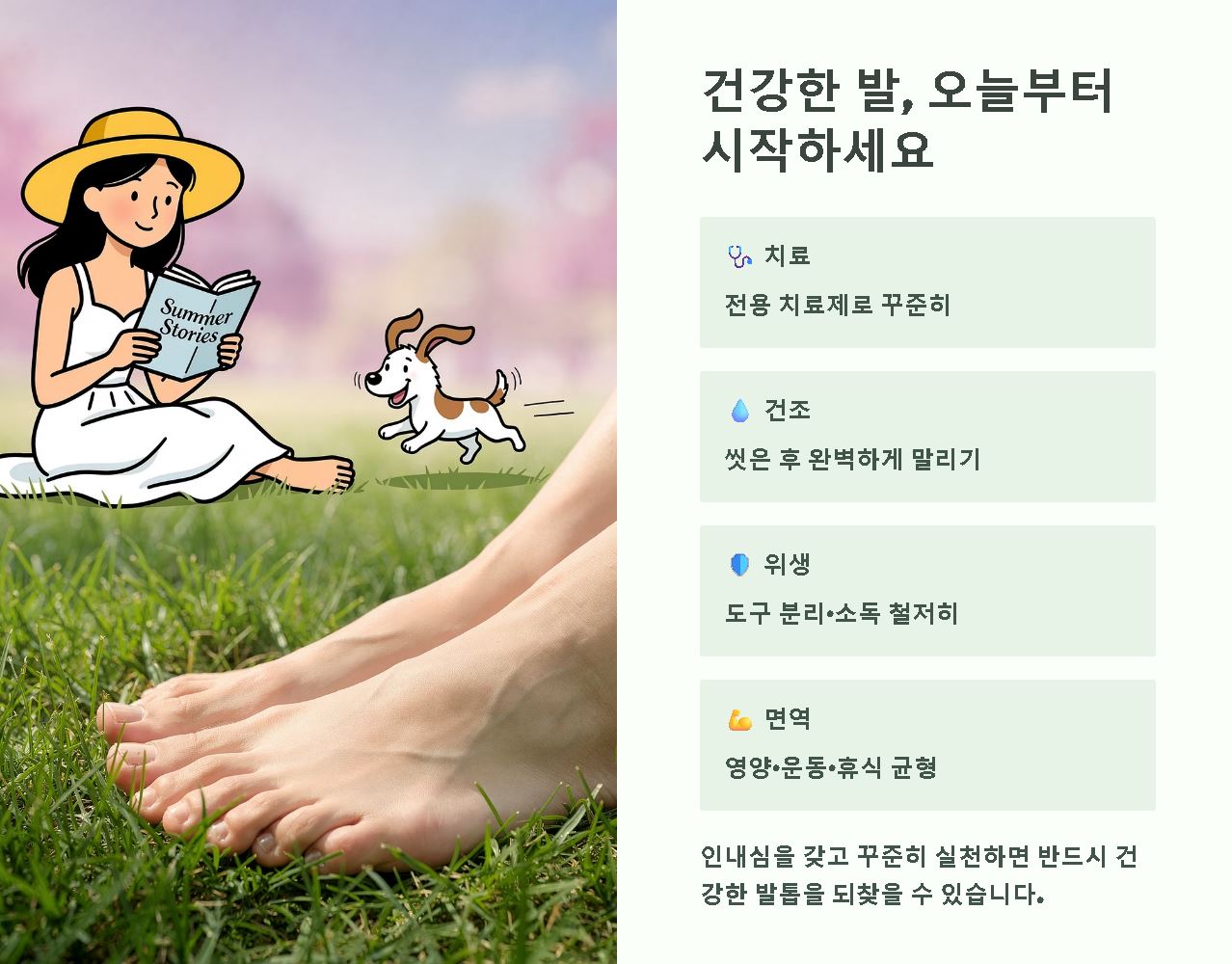 발톱무좀을 없애는 방법은 왕도가 없습니다. 오늘 소개한 관리 수칙들을 일상의 루틴으로 만들어 끈기 있게 실천한다면 깨끗하고 건강한 발톱을 다시 만나실 수 있을 것입니다.