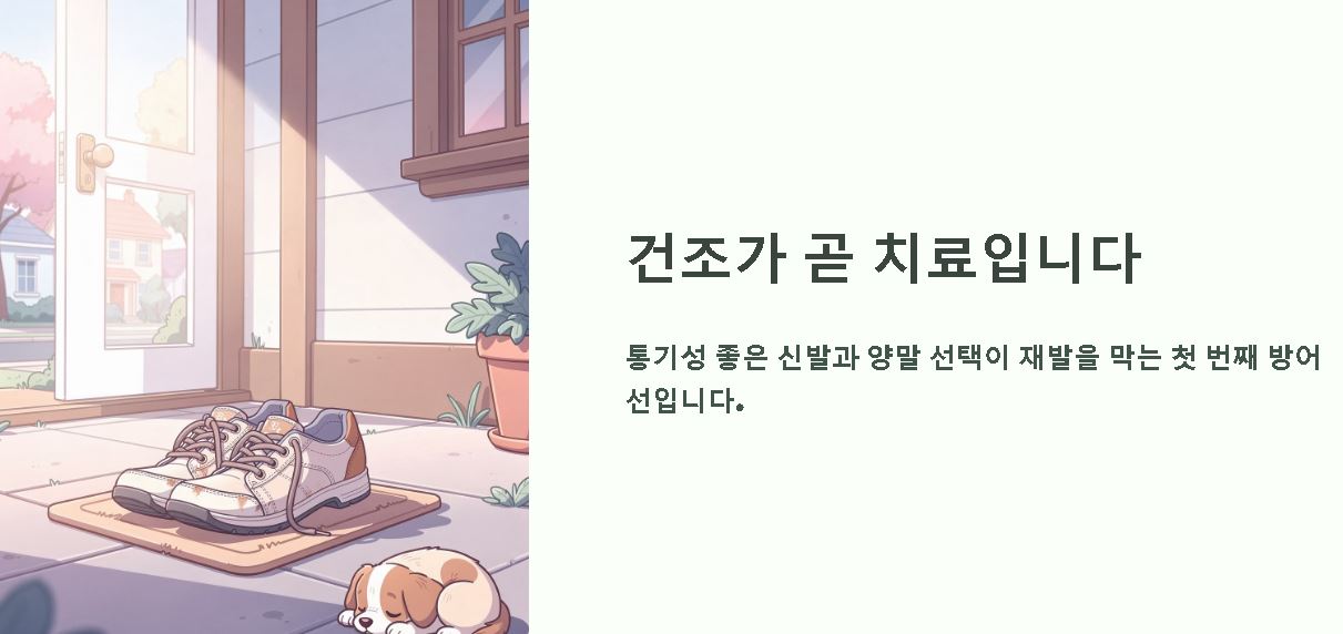 • 기능성 양말 착용: 발가락 양말이나 흡습성이 뛰어난 면 양말은 발가락 사이 접촉과 습기 관리에 유익합니다.