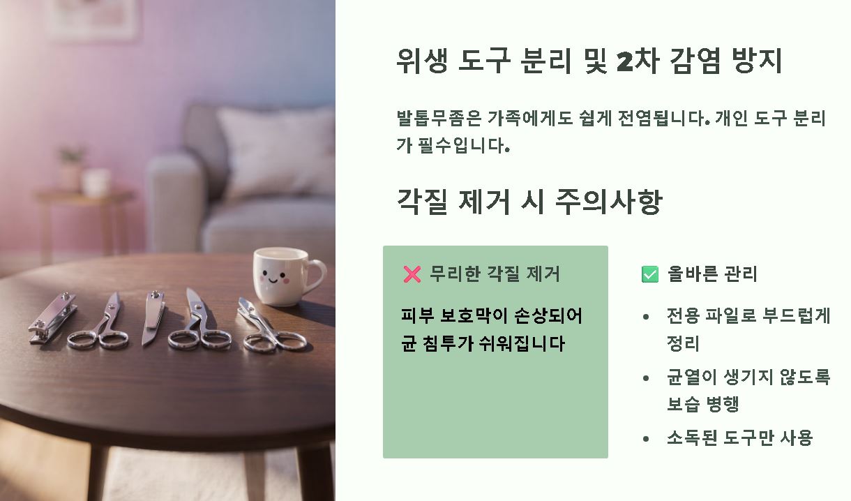 - ✅ 도구 위생 관리: 무좀 발톱을 깎은 손톱깎이를 다른 가족과 공유하거나 소독 없이 사용하는가?