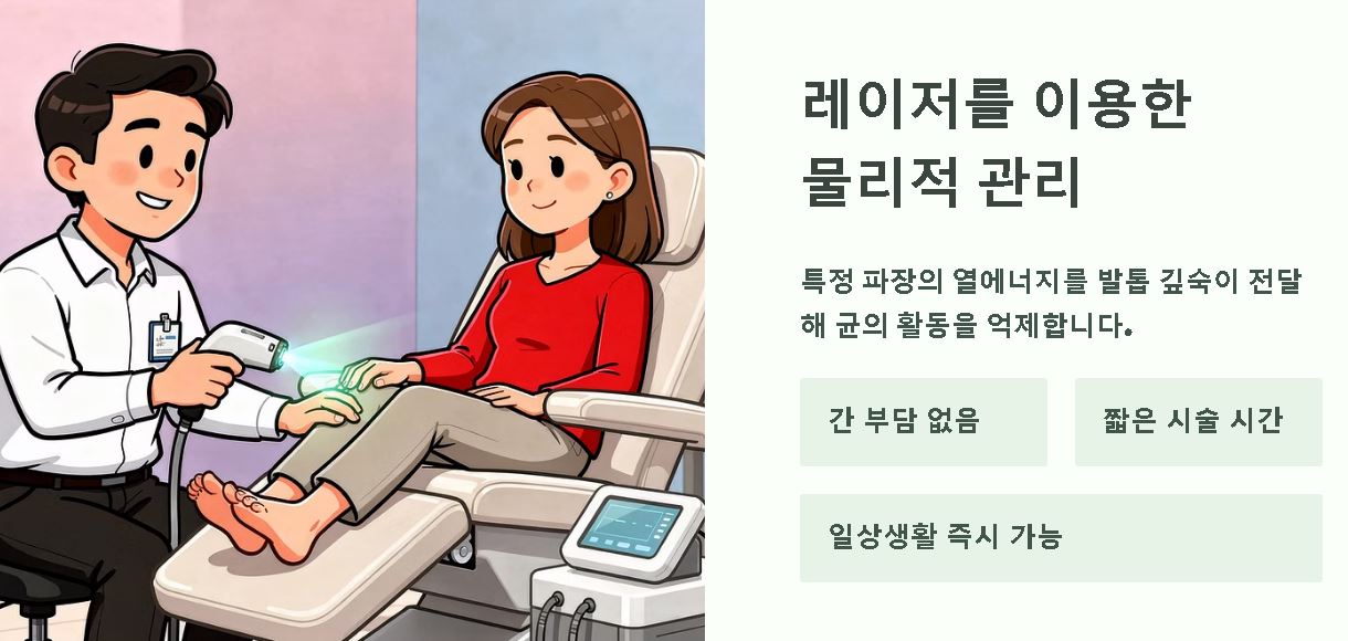 바르는 약만으로 차도가 없거나 먹는 약 복용이 어려운 경우 레이저를 활용한 방법이 대안이 될 수 있습니다. 특정 파장의 열에너지를 발톱 깊숙이 전달하여 균의 활동을 억제하는 원리인데요. 이는 발톱 조직 재생 관리를 돕고 균 사멸 환경 조성 지원에 효과적인 보조 수단이 됩니다.