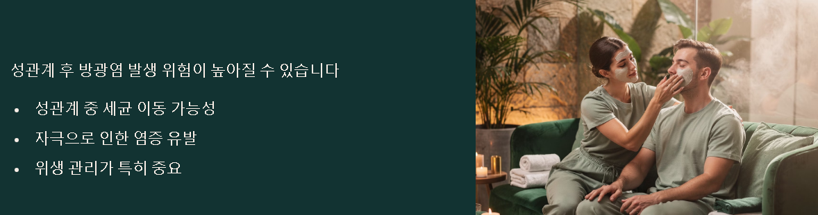 성관계 후에는 반드시 배뇨를 해주고, 개인위생을 철저히 관리하는 것이 방광염 예방에 효과적입니다. 또한, 자주 성관계를 갖는 경우에는 위생 관리와 함께 소변을 자주 보며 방광을 비워주는 것이 중요합니다.
