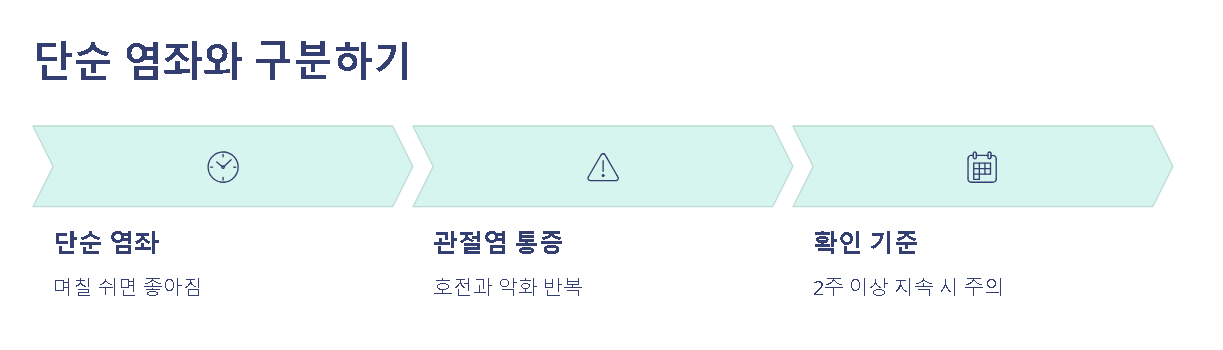 단순한 근육통이나 인대 염좌는 며칠 쉬면 좋아지지만, 관절염 통증은 호전과 악화를 반복하며 서서히 진행되는 특징이 있습니다. 2주 이상 통증이 지속된다면 단순 염좌가 아닐 가능성을 열어두고 확인해 보는 것이 좋습니다.