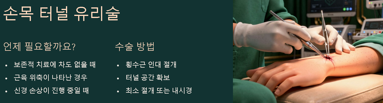 신경을 압박하고 있는 인대를 잘라 터널 공간을 넓혀주는 수술로, 비교적 간단하며 만족도가 높은 편입니다. 최근에는 최소 절개나 내시경을 통해 회복 기간을 획기적으로 단축하고 있습니다.