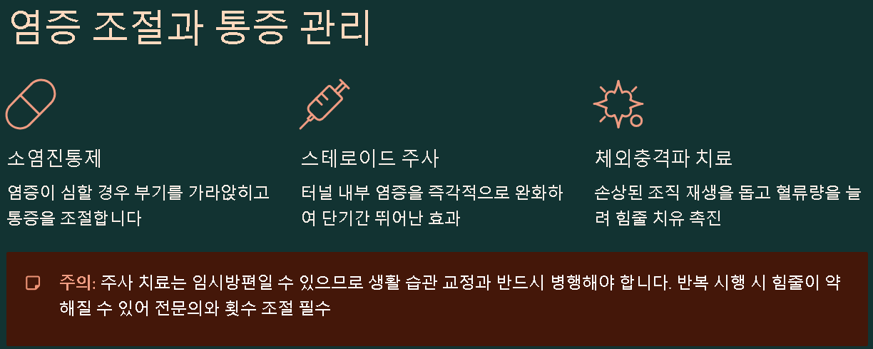 주사 요법은 터널 내부의 염증을 즉각적으로 완화하여 단기간에 뛰어난 효과를 보입니다. 다만, 이는 임시방편일 수 있으므로 생활 습관 교정과 반드시 병행되어야 합니다.