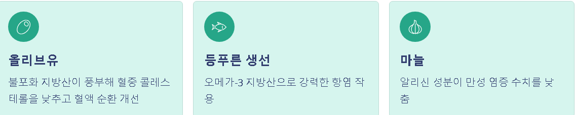 3) 혈압 조절과 염증 완화 (올리브유, 생선, 마늘)