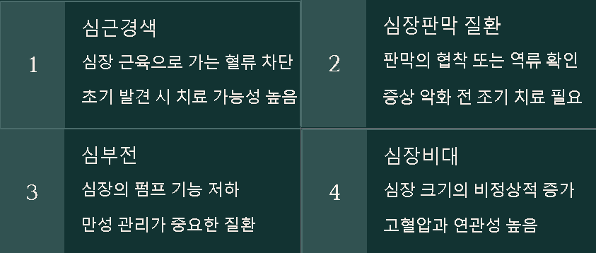 심장 초음파는 심장비대, 판막 질환, 심부전, 심장막염 등을 확인하는 데 유용합니다. 이들 질환은 심장 초음파를 통해 쉽게 검출할 수 있으며, 조기 발견 시 치료가 가능합니다.