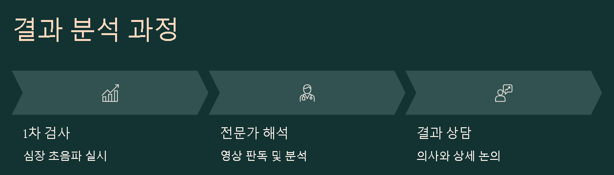 심장 초음파에서 이상이 발견되면 추가적인 심전도, 혈액 검사, 운동부하검사 등을 통해 보다 자세한 진단이 이루어집니다. 이러한 추가 검사를 통해 최종적인 진단을 내리게 됩니다.
