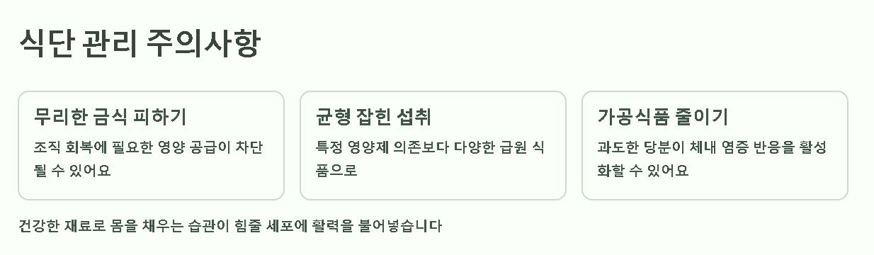 • 무조건적인 금식은 오히려 조직 회복에 필요한 영양 공급을 차단하여 재생 속도를 늦추는 배경이 될 수 있습니다.