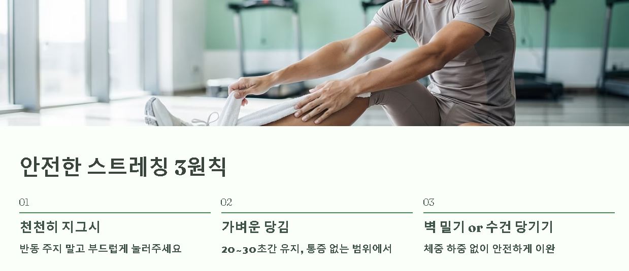 2. 통증이 느껴질 정도로 과하게 늘리기보다는 가벼운 당김이 느껴지는 지점에서 20~30초간 유지하는 방식이 권장됩니다.