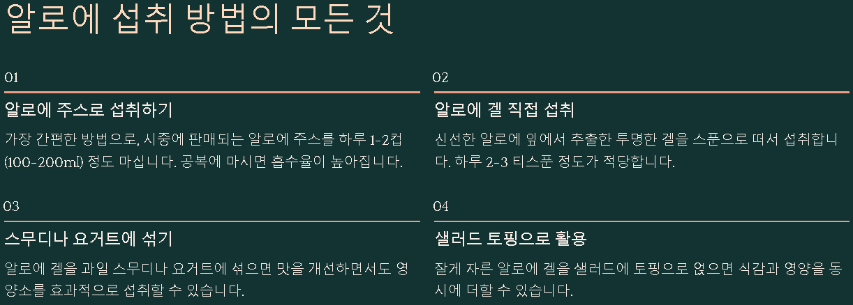 알로에를 섭취할 때는 과도한 양을 피하고, 자신의 체질에 맞게 적당량을 섭취하는 것이 중요합니다. 알로에 주스나 겔을 꾸준히 섭취하며 건강을 관리하세요.