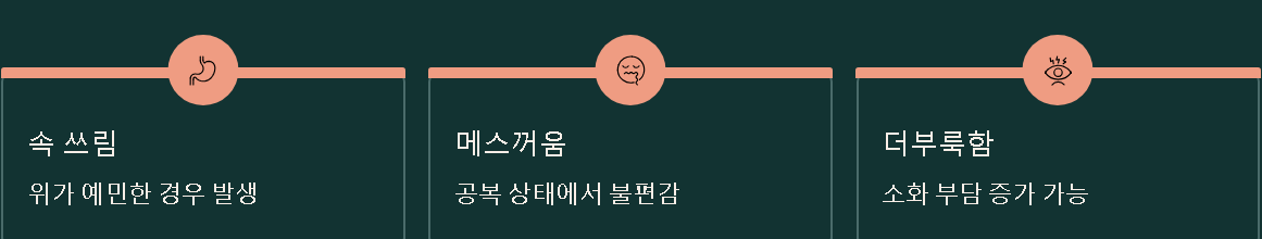 특히 위가 예민한 사람은 공복 복용 시 불편함을 느낄 가능성이 있습니다. 이 경우 복용 시간을 조정하는 것이 도움이 될 수 있습니다.