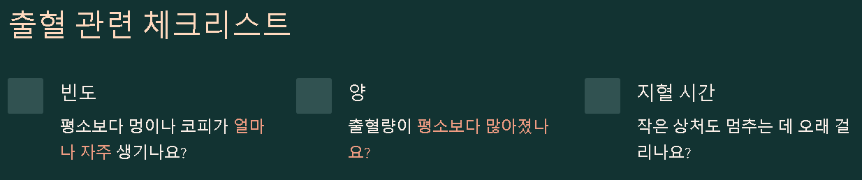 출혈 관련 증상은 “빈도(얼마나 자주), 양(평소보다 많은지), 지혈 시간”을 기준으로 정리해두면 병원에서 원인을 좁히는 데 도움이 됩니다.