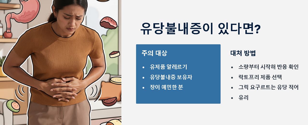 • 장내 환경 균형 유지: 과다 섭취 시 복부 팽만감이나 설사를 유발할 수 있어 관리가 필요합니다.• 칼로리 조절: 요구르트 자체의 지방과 당분을 고려하여 전체 식단 밸런스를 유지해야 합니다.