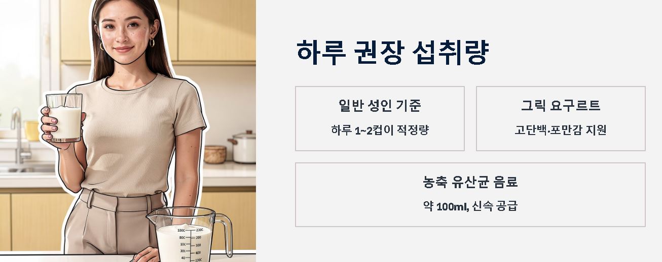 | 일반 요구르트 | 하루 1~2개 (80~150ml) | 장내 유익균 증식 및 관리 보조 |