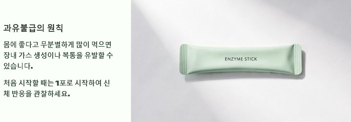 • 장기간 섭취 시 체내 효소 생성 능력에 영향을 주지 않도록 적절히 휴지기를 갖는 것도 고려해 볼 수 있습니다.