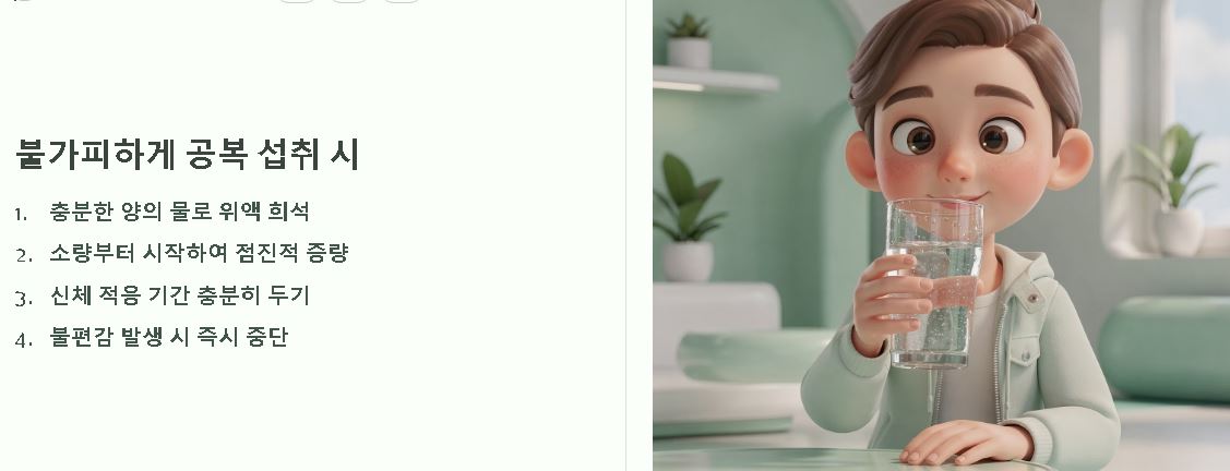 만약 공복에 섭취해야 한다면 충분한 양의 물을 마셔 위액을 희석시킨 뒤 복용하는 것이 자극을 줄이는 데 보탬이 될 수 있습니다. 자신의 소화 능력을 고려하여 조금씩 양을 늘려가며 신체의 적응 기간을 두는 세심한 관리가 필요할 수 있습니다.