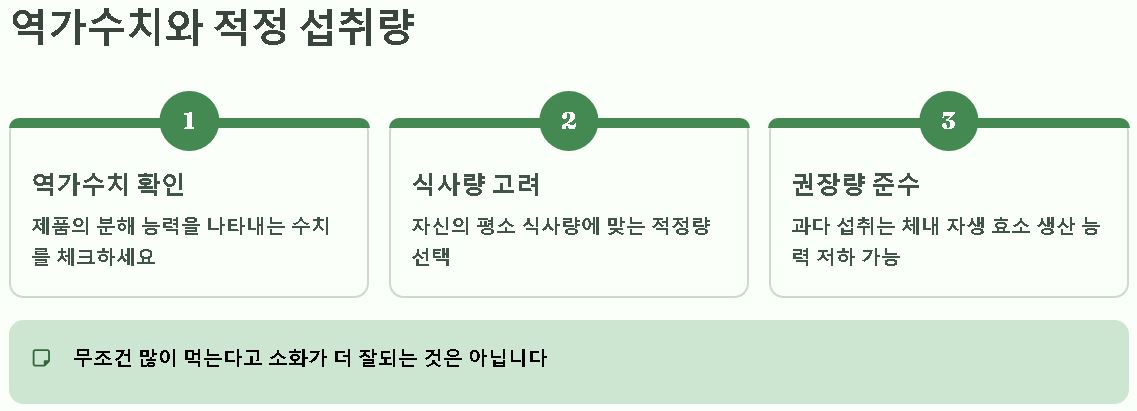 카무트 효소의 효율을 결정짓는 역가수치(분해 능력)를 확인하고 자신의 식사량에 맞는 적정량을 섭취하는 과정이 필요합니다. 무조건 많이 먹는다고 해서 소화가 더 잘되는 것은 아니며, 권장량을 지키는 것이 체내 자생적인 효소 생산 능력을 해치지 않는 길입니다.