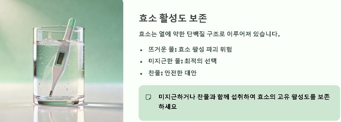 카무트 효소를 섭취할 때 함께 마시는 물의 온도 역시 매우 중요한 변수 중 하나입니다. 효소는 열에 약한 단백질 구조로 이루어져 있어 너무 뜨거운 물과 함께 마시면 활성 기능이 파괴될 가능성이 있는 것으로 알려져 있습니다.