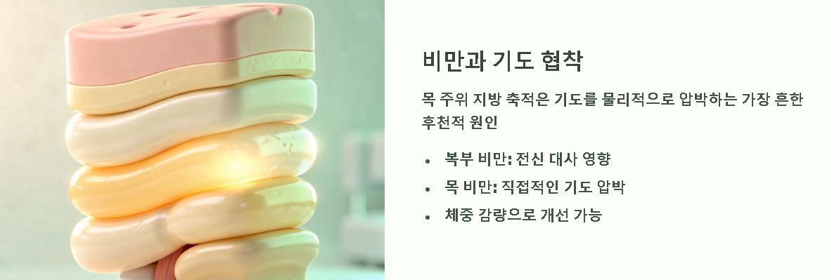| 복부/목 비만 | 지방 조직의 기도 압박 | 호흡 통로 협착 |