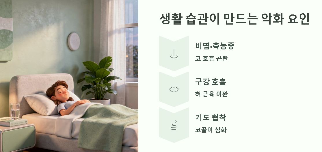 | 구조적 요인 | 작은 턱, 비중격 만곡증 | 공기 흐름 저항 증가 |