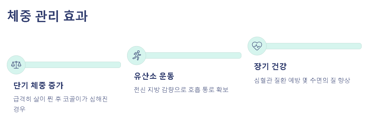 단기간에 급격히 살이 찐 후 코골이가 심해졌다면, 체지방 감량만으로도 증상이 상당히 호전되는 경우가 많습니다. 유산소 운동을 통해 전신 지방을 태우는 노력이 호흡을 편안하게 만드는 데 긍정적인 영향을 줄 수 있습니다.