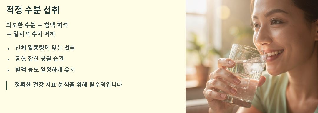 과도한 수분 섭취로 인해 혈액이 희석되면 일시적으로 크레아티닌 수치가 낮게 측정되는 양상을 보일 가능성이 있습니다. 자신의 신체 활동량에 맞는 적정 수분 섭취량을 유지하는 것은 정확한 건강 지표 분석을 위해 필요하며, 균형 잡힌 생활 습관을 통해 혈액 농도를 일정하게 유지하는 태도는 전반적인 신진대사를 안정화하는 데 긍정적인 신호로 작용합니다.