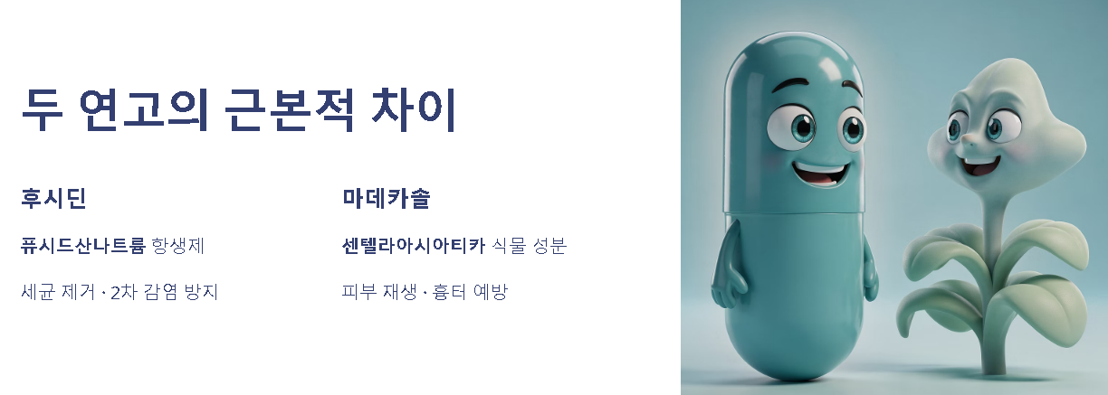 두 연고는 모두 국민 연고로 불리지만, 그 태생적인 목적은 전혀 다릅니다. 후시딘은 '퓨시드산 나트륨'이라는 항생제 성분이 주를 이루어 세균을 죽이고 2차 감염을 막는 것이 핵심 목표입니다. 반면 마데카솔은 '센텔라아시아티카'라는 식물 성분이 콜라겐 합성을 돕고 새 살을 돋게 하여 피부 재생과 흉터 예방에 더 초점을 맞춘 제품으로 이해해 볼 수 있습니다.