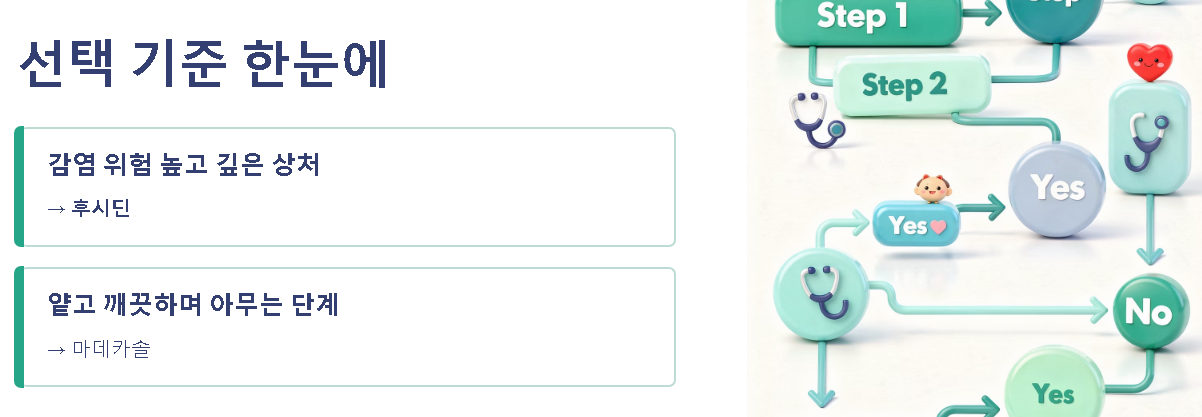 성분의 차이를 이해했다면, 이제 상처의 진행 단계에 따라 어떤 제품을 선택해야 할지 구체적인 기준을 비교해 보는 과정이 도움이 될 수 있습니다.